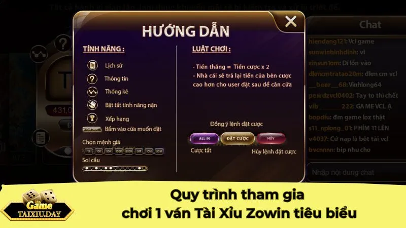 Quy trình tham gia chơi 1 ván Tài Xỉu Zowin tiêu biểu
